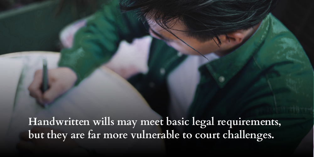 While a handwritten will may be valid, there are several reasons it may not be ideal. Most importantly, a handwritten will suggests that the testator developed the document without the guidance of a legal professional. The will, therefore, could contain errors, provisions that are not enforceable, and decisions that could be challenged down the road.
